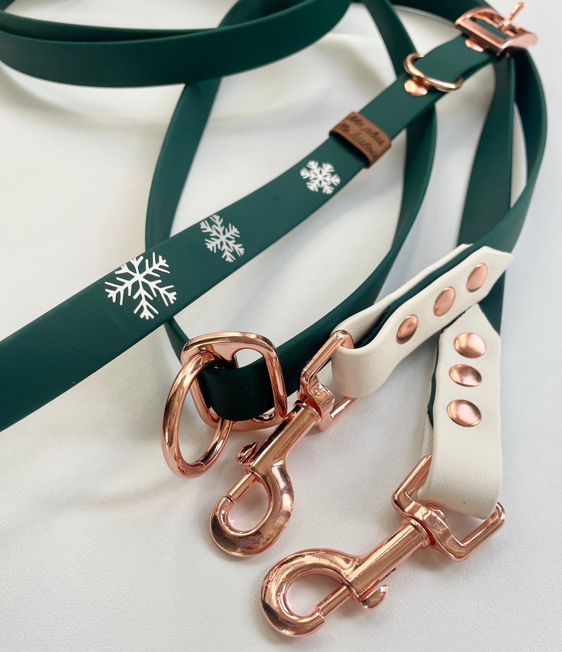 Le collier flocon est un collier vert foncé en 19 mm ou 25mm. La bouclerie rose gold ajoute une luminosité fabuleuse à ce collier orné d’impressions de flocons.
