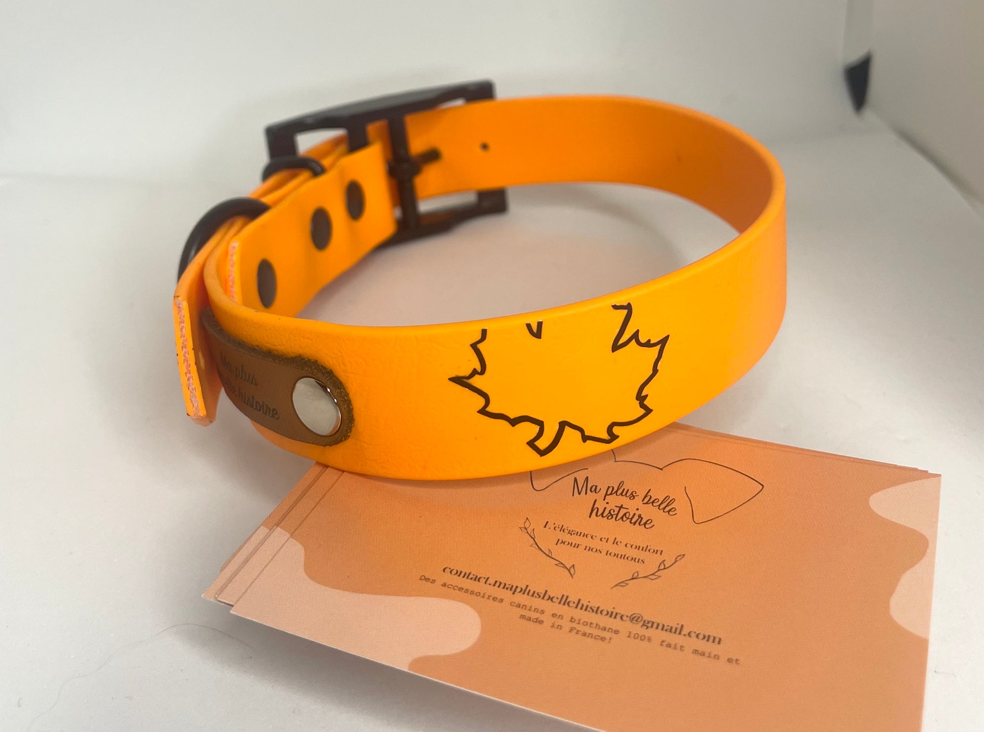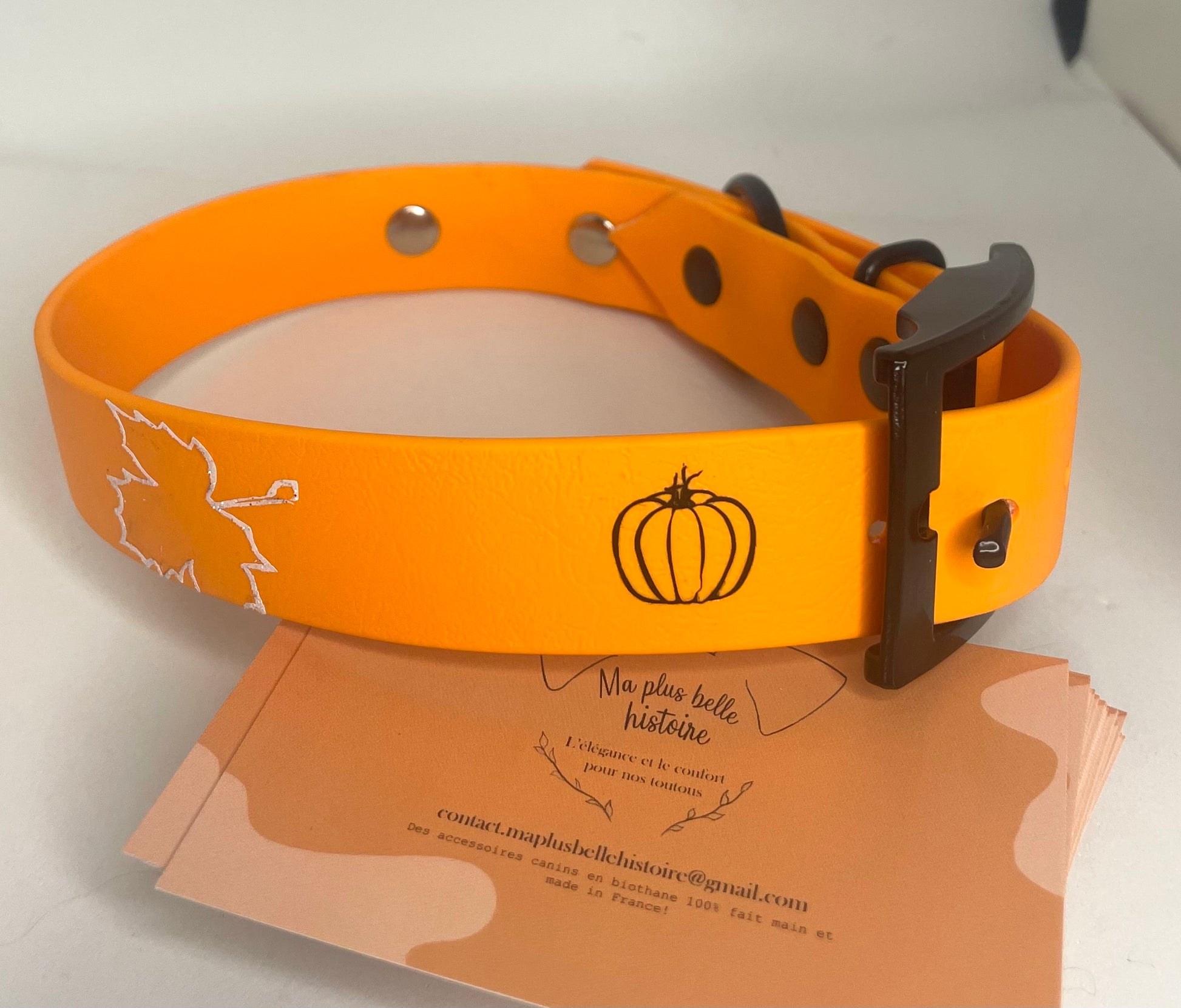 Le collier Ursule est fabriqué à partir de biothane Orange et d’une boucherie noire. S’ajoute à cela une magnifique impression de feuilles et d’une citrouille rappelant l’automne.