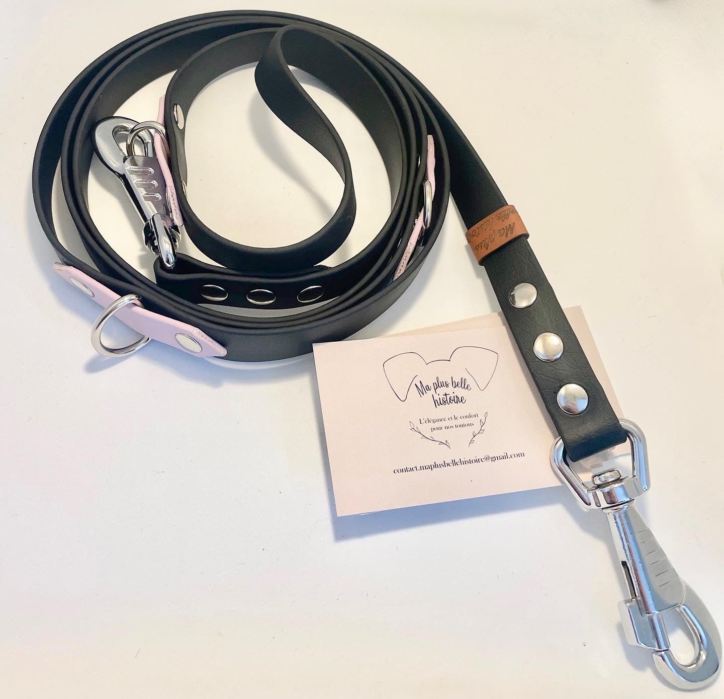 Alliez élégance, confort et qualité en choisissant nos accessoires en biothane fabriqués à la main. Son entretien vous changera la vie : de l'eau claire, du savon et votre produit est comme neuf!